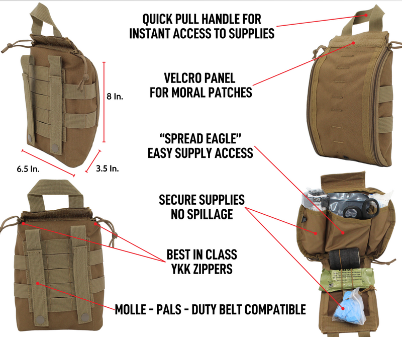 - Design: Rip-open Individual First Aid Kit (IFAK) pouch with MOLLE-compatible mounting straps.